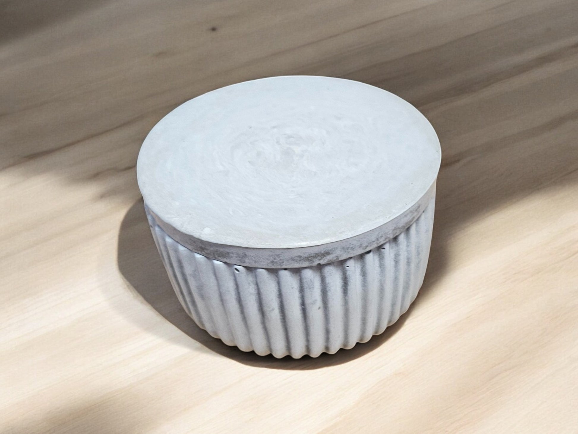 This round concrete box combines raw material aesthetics with soft geometric texture. The vertical ribbed pattern offers a sculptural, modern feel — perfect for organizing small essentials or simply elevating your decor.